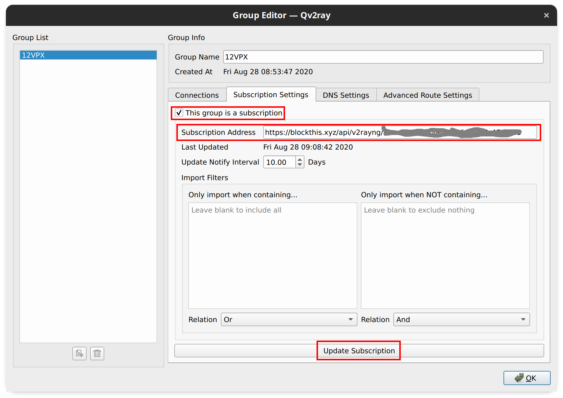 启用This group is a subscription。然后将下方的链接复制并粘贴到Subscription Address字段中。复制链接后,单击Update Subscription按钮以导入我们的服务器。